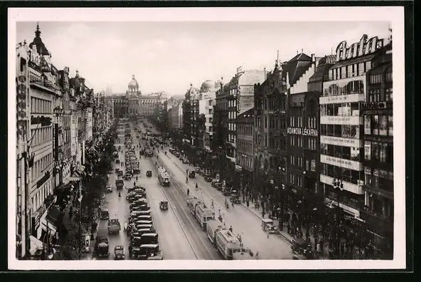 AK Prag, Wenzelsplatz mit Strassenbahn aus der Vogelschau