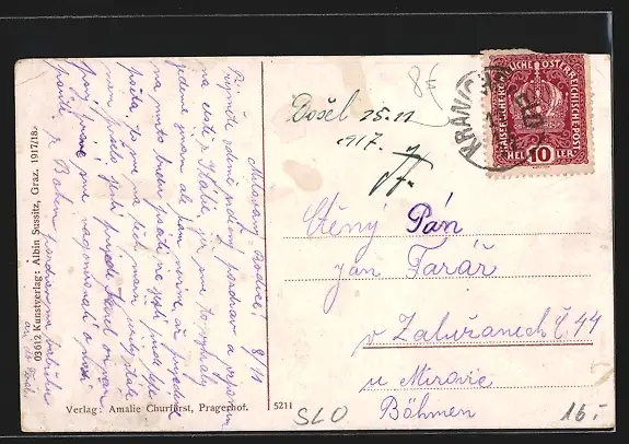 Personenbezogene Daten auf der Rückseite der Karte wurden durch blauen Textmarker unkenntlich gemacht. Die blauen Stellen sind auf die Vorderseite durchgeweicht und wirken sich negativ auf das Postkartenfoto aus