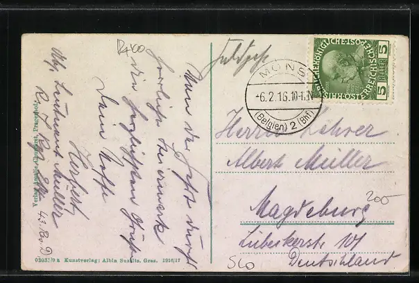 alte Ansichtskarte, gelaufen 1916, Eckknick re. unten, Klebe- und Papierreste oben, guter Zustand