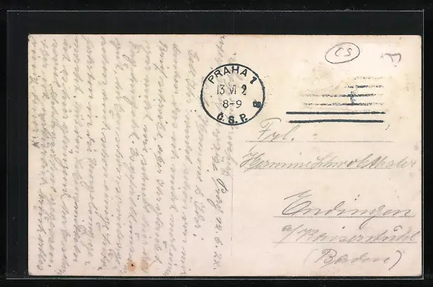 Personenbezogene Daten auf der Rückseite der Karte wurden durch blauen Textmarker unkenntlich gemacht. Die blauen Stellen sind auf die Vorderseite durchgeweicht und wirken sich negativ auf das Postkartenfoto aus