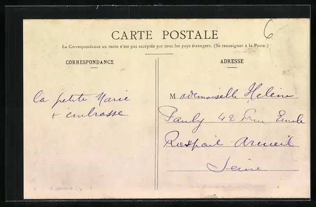 Personenbezogene Daten auf der Rückseite der Karte wurden durch blauen Textmarker unkenntlich gemacht. Die blauen Stellen sind auf die Vorderseite durchgeweicht und wirken sich negativ auf das Postkartenfoto aus