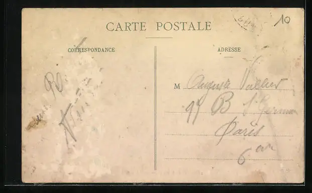 Personenbezogene Daten auf der Rückseite der Karte wurden durch blauen Textmarker unkenntlich gemacht. Die blauen Stellen sind auf die Vorderseite durchgeweicht und wirken sich negativ auf das Postkartenfoto aus