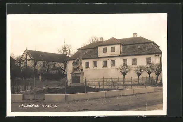 AK Predmerice n. Jizerou, Ortspartie mit Denkmal