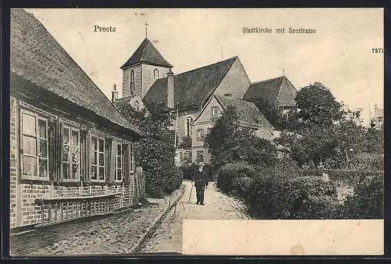 AK Preetz, Stadtkirche und Seestrasse mit Teich, Ortspartie