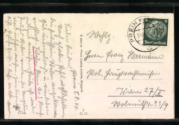 Personenbezogene Daten auf der Rückseite der Karte wurden durch blauen Textmarker unkenntlich gemacht. Die blauen Stellen sind auf die Vorderseite durchgeweicht und wirken sich negativ auf das Postkartenfoto aus