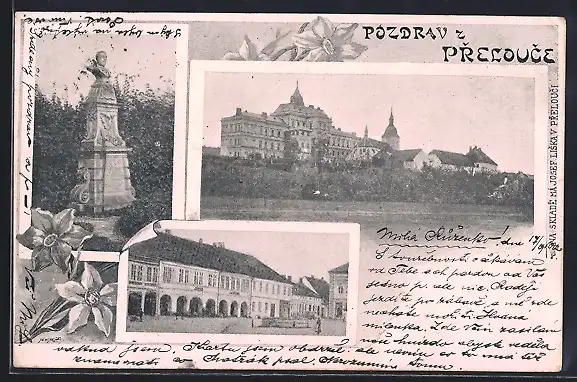 AK Prelouc, Denkmal, Strassenpartie und Ortsansicht