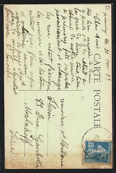 Personenbezogene Daten auf der Rückseite der Karte wurden durch blauen Textmarker unkenntlich gemacht. Die blauen Stellen sind auf die Vorderseite durchgeweicht und wirken sich negativ auf das Postkartenfoto aus