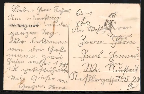 Personenbezogene Daten auf der Rückseite der Karte wurden durch blauen Textmarker unkenntlich gemacht. Die blauen Stellen sind auf die Vorderseite durchgeweicht und wirken sich negativ auf das Postkartenfoto aus