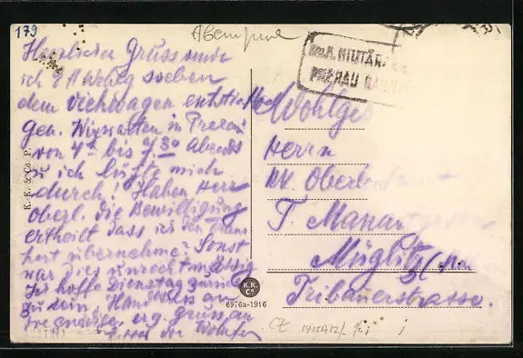 Personenbezogene Daten auf der Rückseite der Karte wurden durch blauen Textmarker unkenntlich gemacht. Die blauen Stellen sind auf die Vorderseite durchgeweicht und wirken sich negativ auf das Postkartenfoto aus