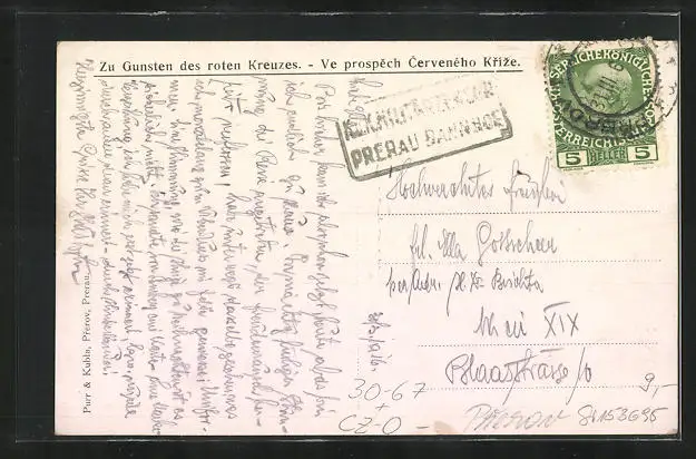 Personenbezogene Daten auf der Rückseite der Karte wurden durch blauen Textmarker unkenntlich gemacht. Die blauen Stellen sind auf die Vorderseite durchgeweicht und wirken sich negativ auf das Postkartenfoto aus