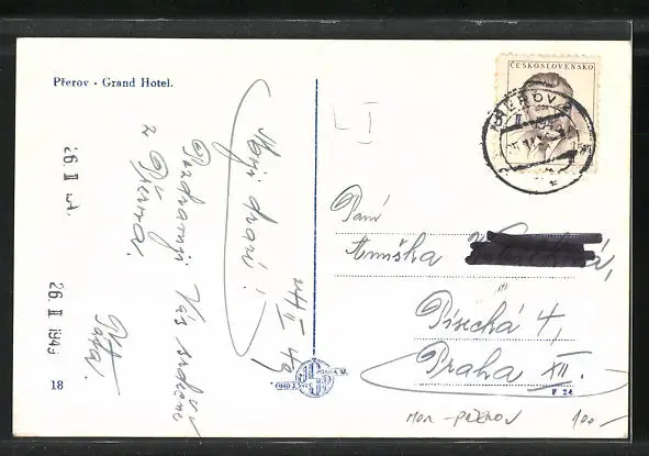 Personenbezogene Daten auf der Rückseite der Karte wurden durch blauen Textmarker unkenntlich gemacht. Die blauen Stellen sind auf die Vorderseite durchgeweicht und wirken sich negativ auf das Postkartenfoto aus
