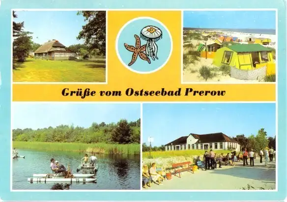 Ansichtskarte Prerow 4 Abb., gestaltet, Rohrdachhaus, Campingplatz A/19, Wassertreter auf dem Prerowstrom, "Dünenhaus" und Strandübergang Erhaltung I-II, Ecken leicht angestossen postalisch gelaufen, gestempelt: Ribnitz-Damgarten, 1.6.87 Druckvermerk: 1986 Herstellungsland: DDR Verlag: Bild und Heimat Reichenbach - 01 01 0680/03
