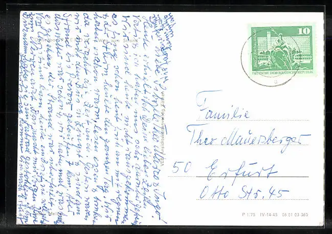 Personenbezogene Daten auf der Rückseite der Karte wurden durch blauen Textmarker unkenntlich gemacht. Die blauen Stellen sind auf die Vorderseite durchgeweicht und wirken sich negativ auf das Postkartenfoto aus