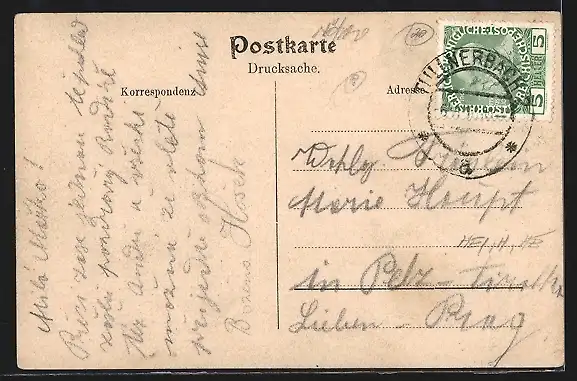 Personenbezogene Daten auf der Rückseite der Karte wurden durch blauen Textmarker unkenntlich gemacht. Die blauen Stellen sind auf die Vorderseite durchgeweicht und wirken sich negativ auf das Postkartenfoto aus