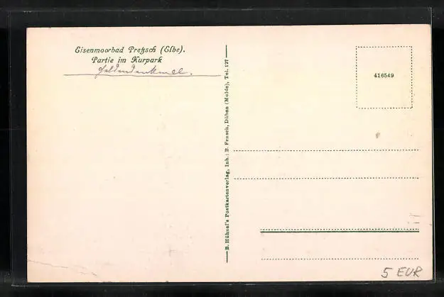 Personenbezogene Daten auf der Rückseite der Karte wurden durch blauen Textmarker unkenntlich gemacht. Die blauen Stellen sind auf die Vorderseite durchgeweicht und wirken sich negativ auf das Postkartenfoto aus