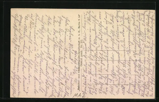 Personenbezogene Daten auf der Rückseite der Karte wurden durch blauen Textmarker unkenntlich gemacht. Die blauen Stellen sind auf die Vorderseite durchgeweicht und wirken sich negativ auf das Postkartenfoto aus