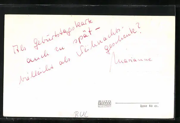 Personenbezogene Daten auf der Rückseite der Karte wurden durch blauen Textmarker unkenntlich gemacht. Die blauen Stellen sind auf die Vorderseite durchgeweicht und wirken sich negativ auf das Postkartenfoto aus
