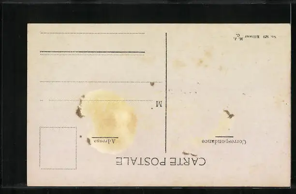 Personenbezogene Daten auf der Rückseite der Karte wurden durch blauen Textmarker unkenntlich gemacht. Die blauen Stellen sind auf die Vorderseite durchgeweicht und wirken sich negativ auf das Postkartenfoto aus