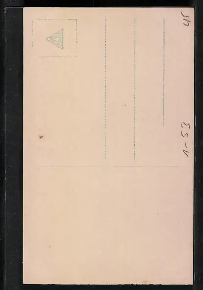 Personenbezogene Daten auf der Rückseite der Karte wurden durch blauen Textmarker unkenntlich gemacht. Die blauen Stellen sind auf die Vorderseite durchgeweicht und wirken sich negativ auf das Postkartenfoto aus
