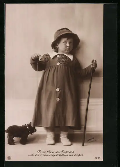 AK Prinz Alexander Ferdinand, Sohn des Prinzen August Wilhelm von Preussen im Kindesalter mit Gehstock und Plüschtier