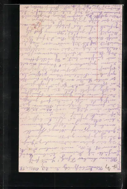 Personenbezogene Daten auf der Rückseite der Karte wurden durch blauen Textmarker unkenntlich gemacht. Die blauen Stellen sind auf die Vorderseite durchgeweicht und wirken sich negativ auf das Postkartenfoto aus