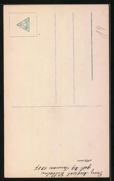 Personenbezogene Daten auf der Rückseite der Karte wurden durch blauen Textmarker unkenntlich gemacht. Die blauen Stellen sind auf die Vorderseite durchgeweicht und wirken sich negativ auf das Postkartenfoto aus