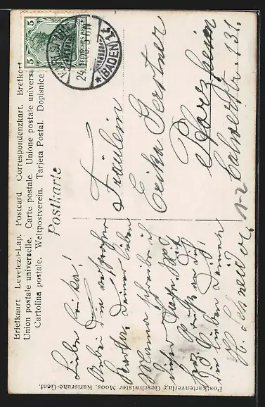 Personenbezogene Daten auf der Rückseite der Karte wurden durch blauen Textmarker unkenntlich gemacht. Die blauen Stellen sind auf die Vorderseite durchgeweicht und wirken sich negativ auf das Postkartenfoto aus