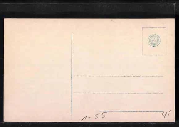 Personenbezogene Daten auf der Rückseite der Karte wurden durch blauen Textmarker unkenntlich gemacht. Die blauen Stellen sind auf die Vorderseite durchgeweicht und wirken sich negativ auf das Postkartenfoto aus