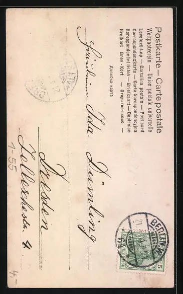 Personenbezogene Daten auf der Rückseite der Karte wurden durch blauen Textmarker unkenntlich gemacht. Die blauen Stellen sind auf die Vorderseite durchgeweicht und wirken sich negativ auf das Postkartenfoto aus