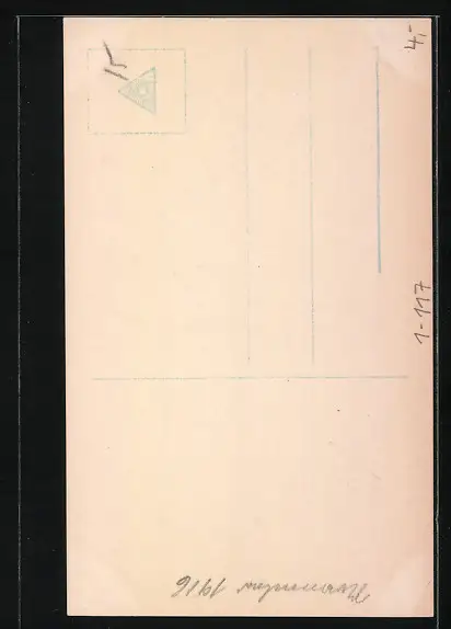 Personenbezogene Daten auf der Rückseite der Karte wurden durch blauen Textmarker unkenntlich gemacht. Die blauen Stellen sind auf die Vorderseite durchgeweicht und wirken sich negativ auf das Postkartenfoto aus