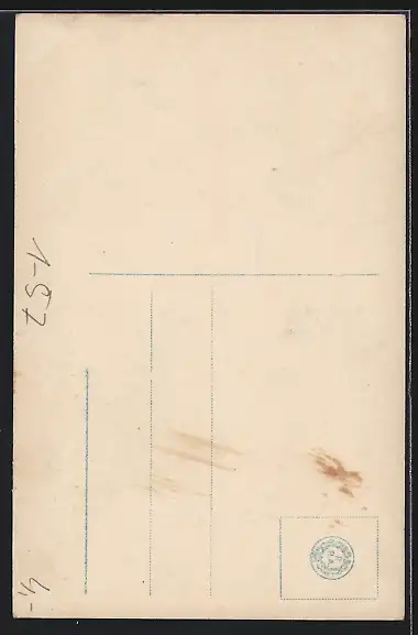 Personenbezogene Daten auf der Rückseite der Karte wurden durch blauen Textmarker unkenntlich gemacht. Die blauen Stellen sind auf die Vorderseite durchgeweicht und wirken sich negativ auf das Postkartenfoto aus