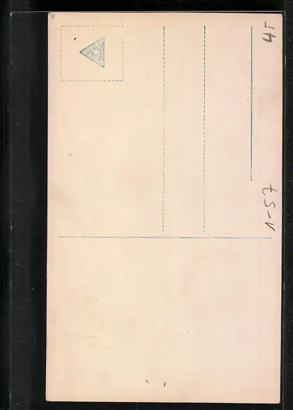 Personenbezogene Daten auf der Rückseite der Karte wurden durch blauen Textmarker unkenntlich gemacht. Die blauen Stellen sind auf die Vorderseite durchgeweicht und wirken sich negativ auf das Postkartenfoto aus
