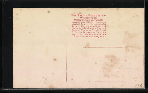 Personenbezogene Daten auf der Rückseite der Karte wurden durch blauen Textmarker unkenntlich gemacht. Die blauen Stellen sind auf die Vorderseite durchgeweicht und wirken sich negativ auf das Postkartenfoto aus