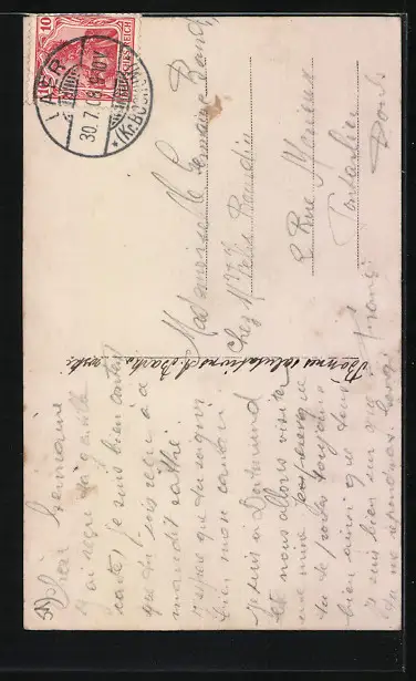 Personenbezogene Daten auf der Rückseite der Karte wurden durch blauen Textmarker unkenntlich gemacht. Die blauen Stellen sind auf die Vorderseite durchgeweicht und wirken sich negativ auf das Postkartenfoto aus