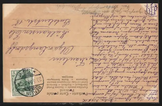 Personenbezogene Daten auf der Rückseite der Karte wurden durch blauen Textmarker unkenntlich gemacht. Die blauen Stellen sind auf die Vorderseite durchgeweicht und wirken sich negativ auf das Postkartenfoto aus