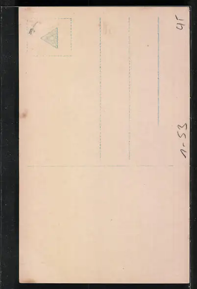 Personenbezogene Daten auf der Rückseite der Karte wurden durch blauen Textmarker unkenntlich gemacht. Die blauen Stellen sind auf die Vorderseite durchgeweicht und wirken sich negativ auf das Postkartenfoto aus