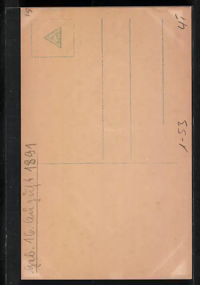 Personenbezogene Daten auf der Rückseite der Karte wurden durch blauen Textmarker unkenntlich gemacht. Die blauen Stellen sind auf die Vorderseite durchgeweicht und wirken sich negativ auf das Postkartenfoto aus