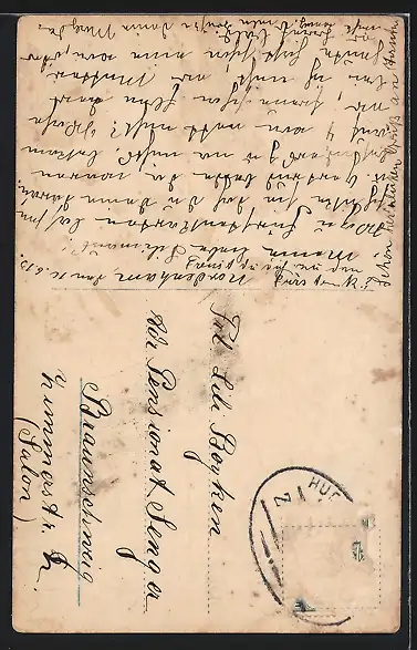Personenbezogene Daten auf der Rückseite der Karte wurden durch blauen Textmarker unkenntlich gemacht. Die blauen Stellen sind auf die Vorderseite durchgeweicht und wirken sich negativ auf das Postkartenfoto aus