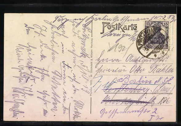 Personenbezogene Daten auf der Rückseite der Karte wurden durch blauen Textmarker unkenntlich gemacht. Die blauen Stellen sind auf die Vorderseite durchgeweicht und wirken sich negativ auf das Postkartenfoto aus