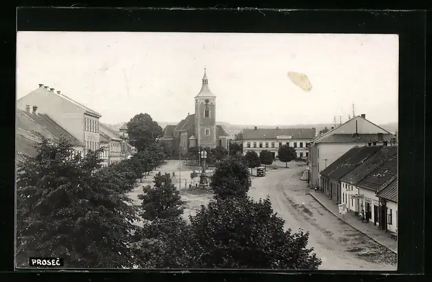 AK Prosec, Strassenpartie mit Kirche und Denkmal