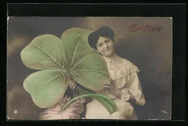 AK Prosit Neujahr, Dame mit Kleeblatt-Motiv