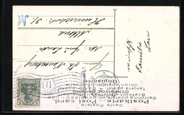 Personenbezogene Daten auf der Rückseite der Karte wurden durch blauen Textmarker unkenntlich gemacht. Die blauen Stellen sind auf die Vorderseite durchgeweicht und wirken sich negativ auf das Postkartenfoto aus