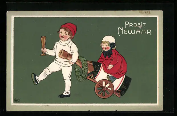 AK Prosit Neujahr!, Junge und Mädchen mit Sektflasche