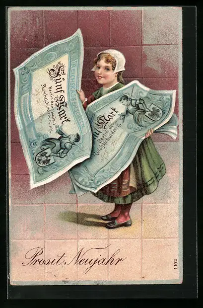 AK Prosit Neujahr, Junges Mädchen mit Geldscheinen
