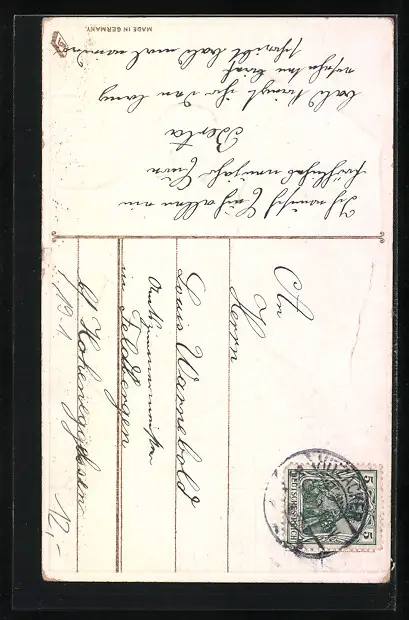 Personenbezogene Daten auf der Rückseite der Karte wurden durch blauen Textmarker unkenntlich gemacht. Die blauen Stellen sind auf die Vorderseite durchgeweicht und wirken sich negativ auf das Postkartenfoto aus