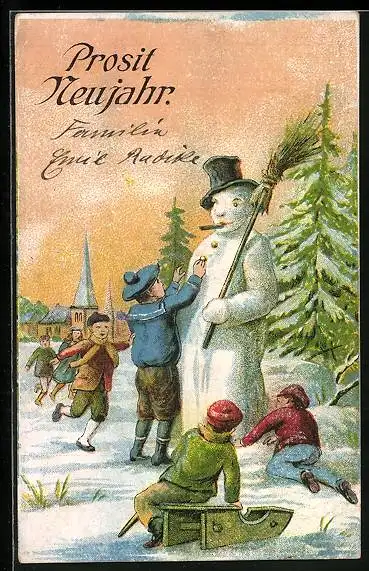 AK Prosit Neujahr, Kinder bauen einen Schneemann