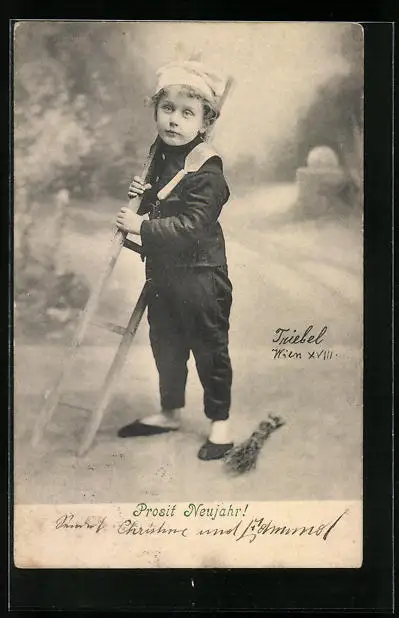 AK Prosit Neujahr, Kleiner Junge im Schornsteinfeger-Kostüm zum Neujahr