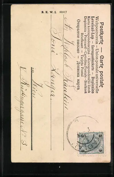 Personenbezogene Daten auf der Rückseite der Karte wurden durch blauen Textmarker unkenntlich gemacht. Die blauen Stellen sind auf die Vorderseite durchgeweicht und wirken sich negativ auf das Postkartenfoto aus
