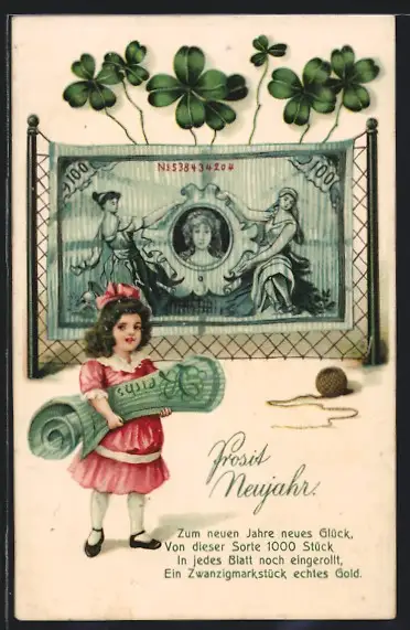 AK Prosit Neujahr, Kleines Mädchen mit Geldschein, Kleeblätter