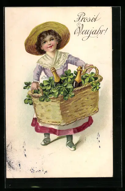 AK Prosit Neujahr!, Mädchen mit Sekt und Klee